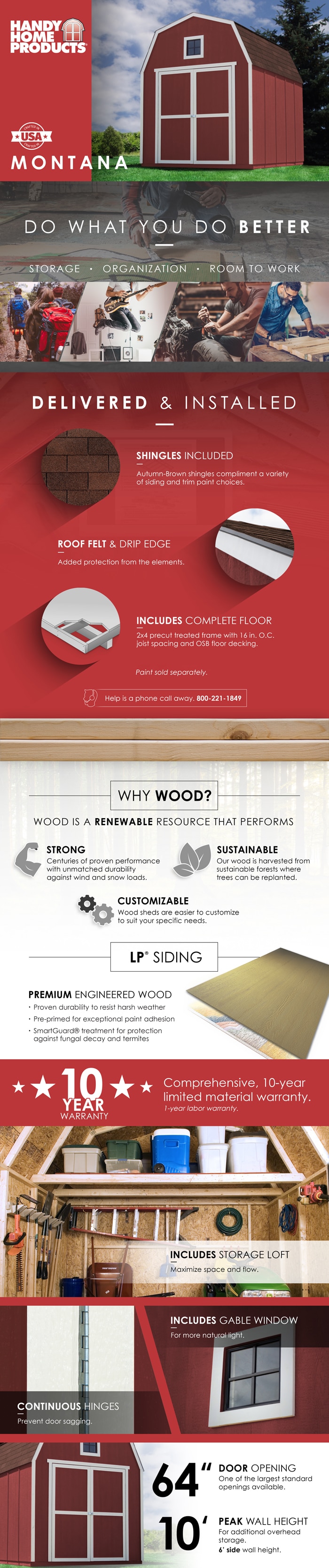 This 8 ft. x 10 ft. Handy Home Products wood storage shed provides 685 cu. ft. of space for maximum storage potential. It includes autumn brown shingles, roof felt, drip edge and standard OSB floor decking upon delivery and professional installation. This shed provides plenty of stand-tall storage and extra-wide double door for easy access for riding mowers, lawn equipment and other large gardening and yard tools. The unique gambrel-style roof provides extra overhead room and a traditional appearance. In addition to the included fixed gable window and over-head storage loft, this storage shed provides a finished appearance and functional interior. It must be installed on a flat, level surface, and site preparation is not included.