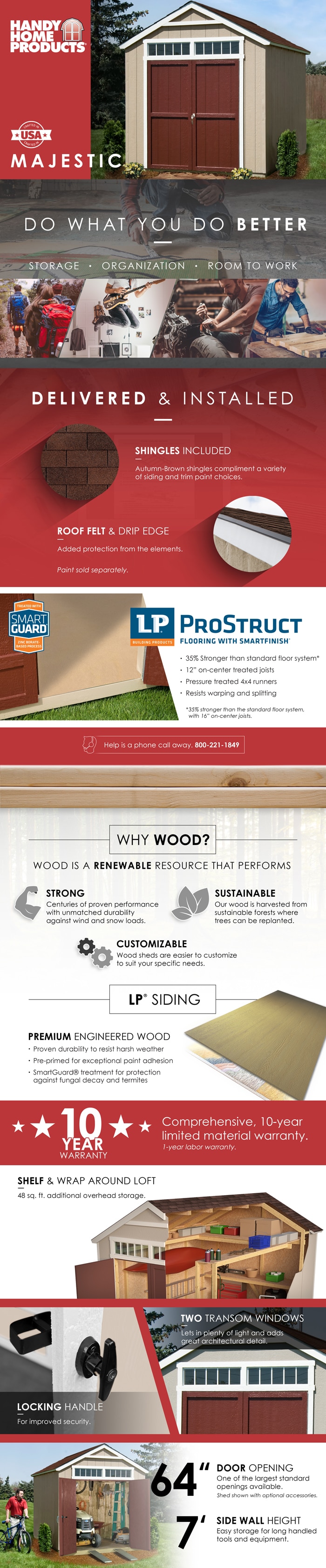 This 8 ft. x 12 ft. Handy Home Products wood storage shed provides 768 cu. ft. of space for maximum storage potential. It includes an additional 48 sq. ft. of overhead space and autumn brown shingles. You can paint the light brown, pre-primed wood siding to match your home. This wide, gable-style storage shed features two over-door transom windows and 7 ft. H sidewalls for generous headroom. It can accommodate most lawn tractors. Durably constructed to withstand inclement weather, it includes a lockable door latch to ensure safety and security while storing your items. Included with the purchase are reliable delivery and professional installation. The shed must be installed on a flat, level surface, and site preparation is not included.