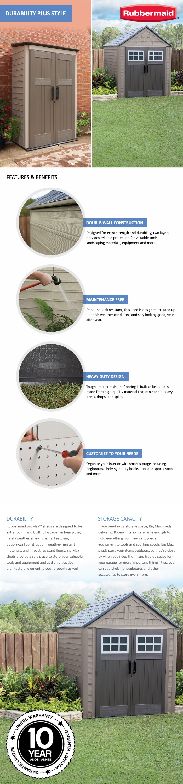 Rubbermaid Big Max shed is great for storing riding mowers and other lawn and garden equipment. Its stylish design specifically intended to blend into your outdoor living space. Durable, double wall construction provides extra strength and security. The Rubbermaid Big Max compliments your home and yard.